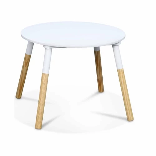 La table TOBIAS, haute de 43 cm, est adaptée à la taille de votre enfant afin qu’il soit merveilleusement bien installé pour toutes ses activités. Dessiner, peindre, goûter avec ses amis ou frères et sœurs, jouer à la dinette… Et avec sa forme ronde, impossible de se cogner aux recoins ! Les deux tabourets fournis sont parfaitement assortis à la table : un blanc qui éclaircira votre pièce, et du bois massif en pin naturel pour un style scandinave très appréciable.