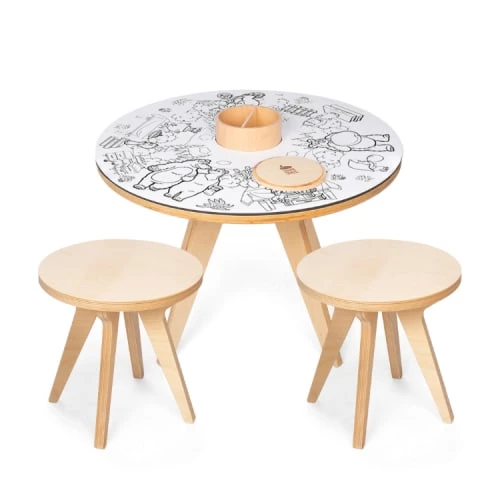 Optez pour le joli (et ludique) ensemble de table et ses tabourets en bois pour enfants ! Cette table pour enfant est bien plus qu’une simple table. C’est une table à dessiner intelligente, avec un design minimaliste et scandinave, inventé et créée à hauteur d’enfant !