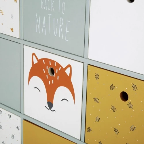 Tiroirs : panneaux de fibres de moyenne densité, coloris blanc, vert clair et ocre avec motifs imprimés
