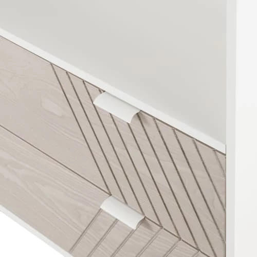 Façades des tiroirs : panneaux de fibres de moyenne densité et placage frêne blanchi avec motifs géométriques sculptés, vernis nitrocellulosique finition mate