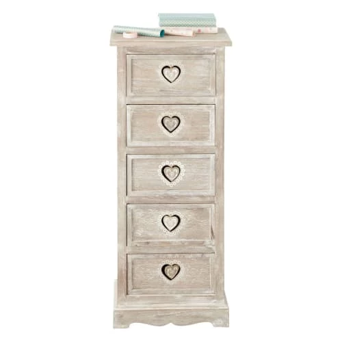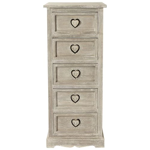 Offrez une touche de romantisme à votre chambre avec la colonne de rangement grisée effet vieilli CAMILLE. Cet adorable meuble en bois lasuré blanc et grisé se compose de 5 tiroirs pour ranger vos petites affaires. Avec un cœur pour chaque poignée, ce meuble de rangement pratique et peu encombrant, apportera une note féminine à votre déco de chambre romantique. Complétez cet univers poétique avec la coiffeuse, le secrétaire et la commode de la même collection.